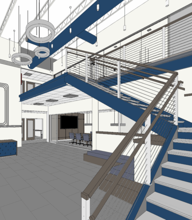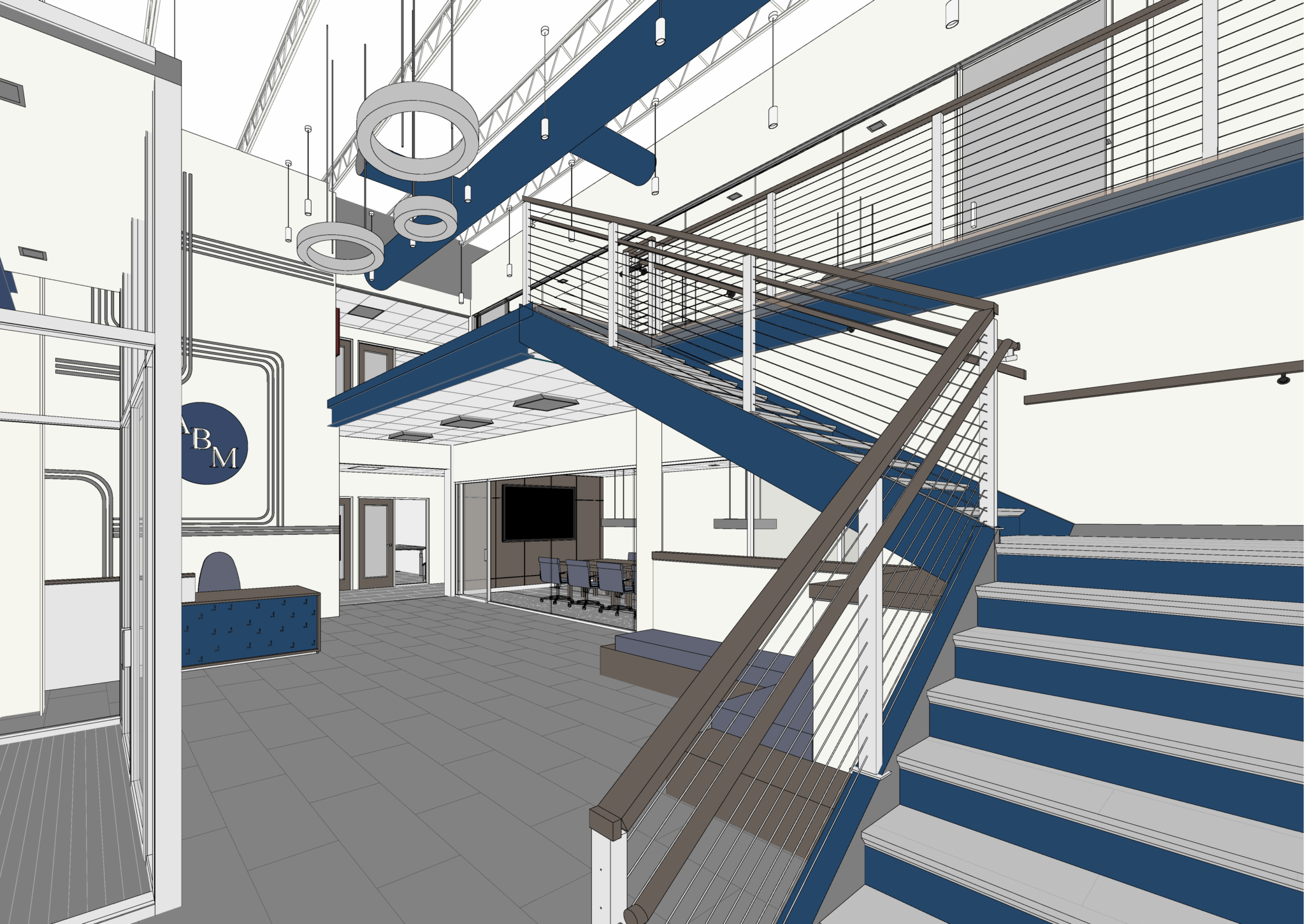 Architecture & interior design Designed a two-story office with an open lobby, integrated mechanical elements, conference rooms on both levels, and a cohesive interior reflecting ABM’s identity.
