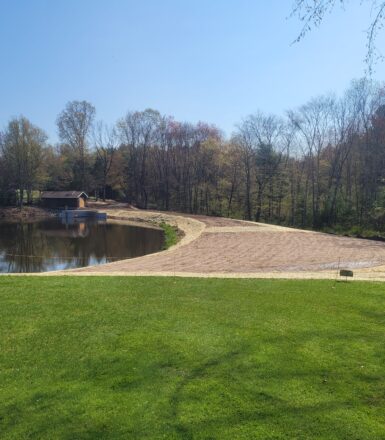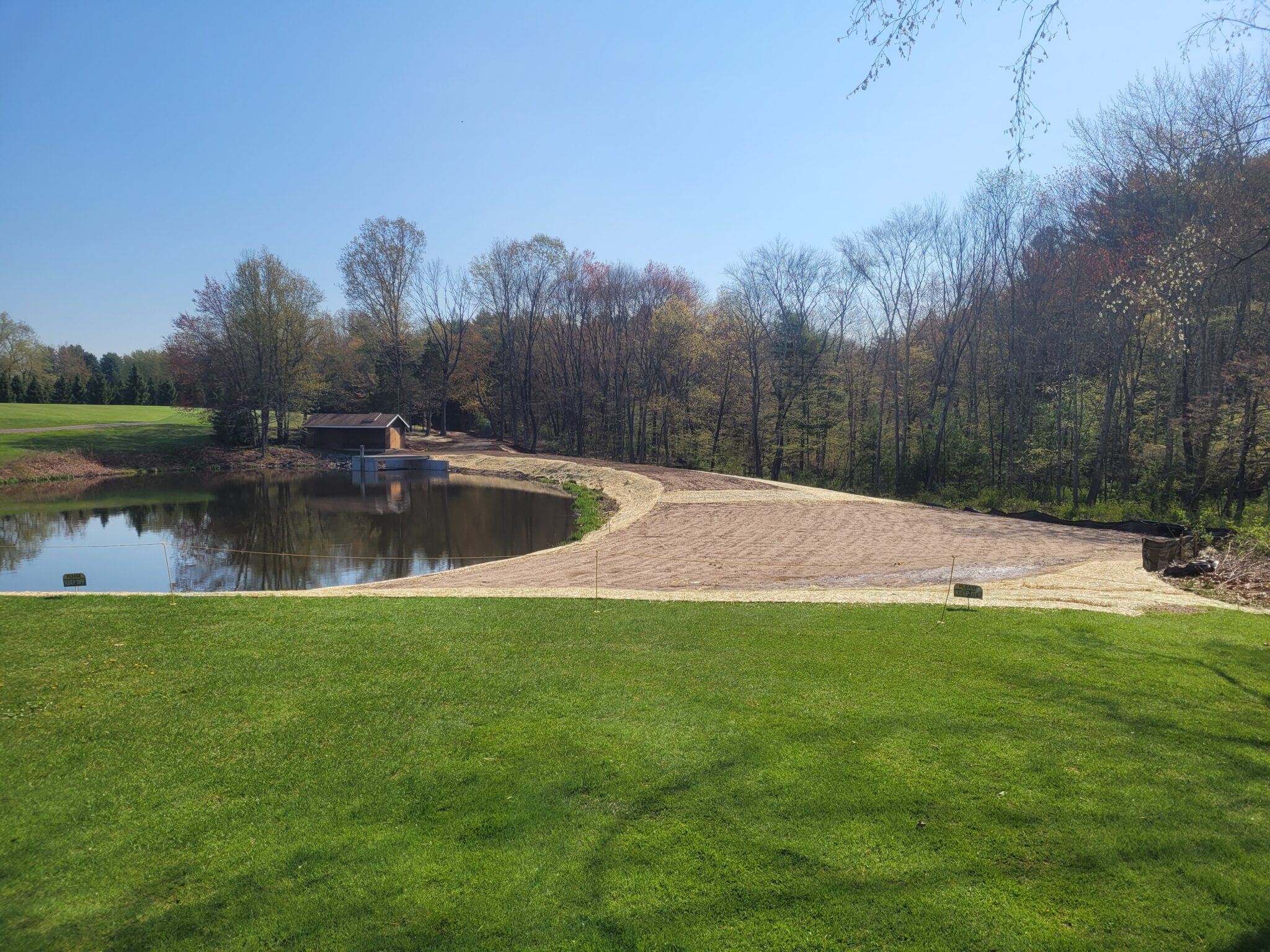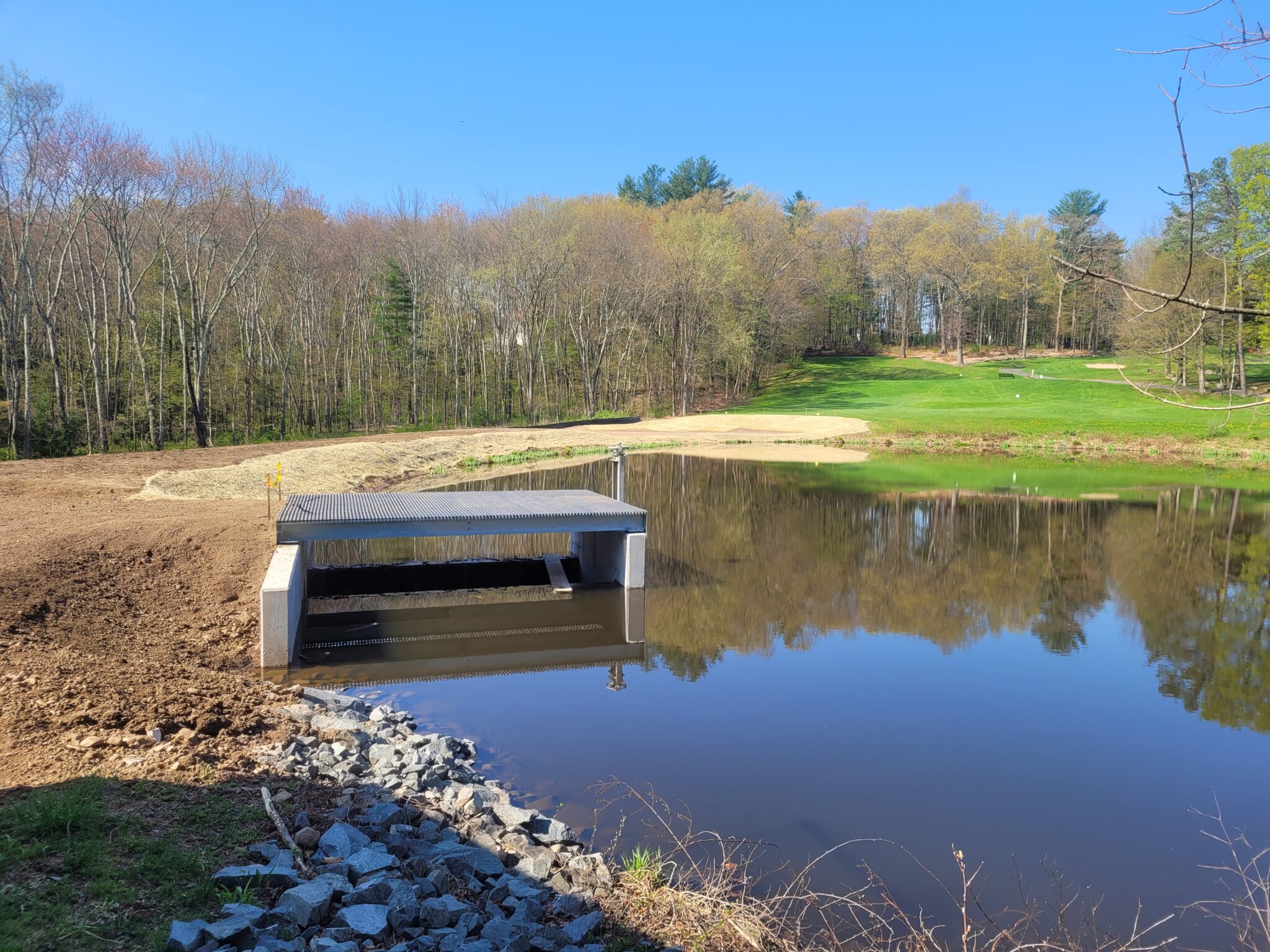 Executing this work brought unique environmental and logistical challenges. The pond is one of the golf course’s few water hazards and is home to a robust population of carp that act as natural cleaners for the water body. To protect them, the fish needed to be captured, relocated to a neighboring pond for the duration of construction.  Because the pond provided critical irrigation water, construction could only be undertaken in the late fall or winter.